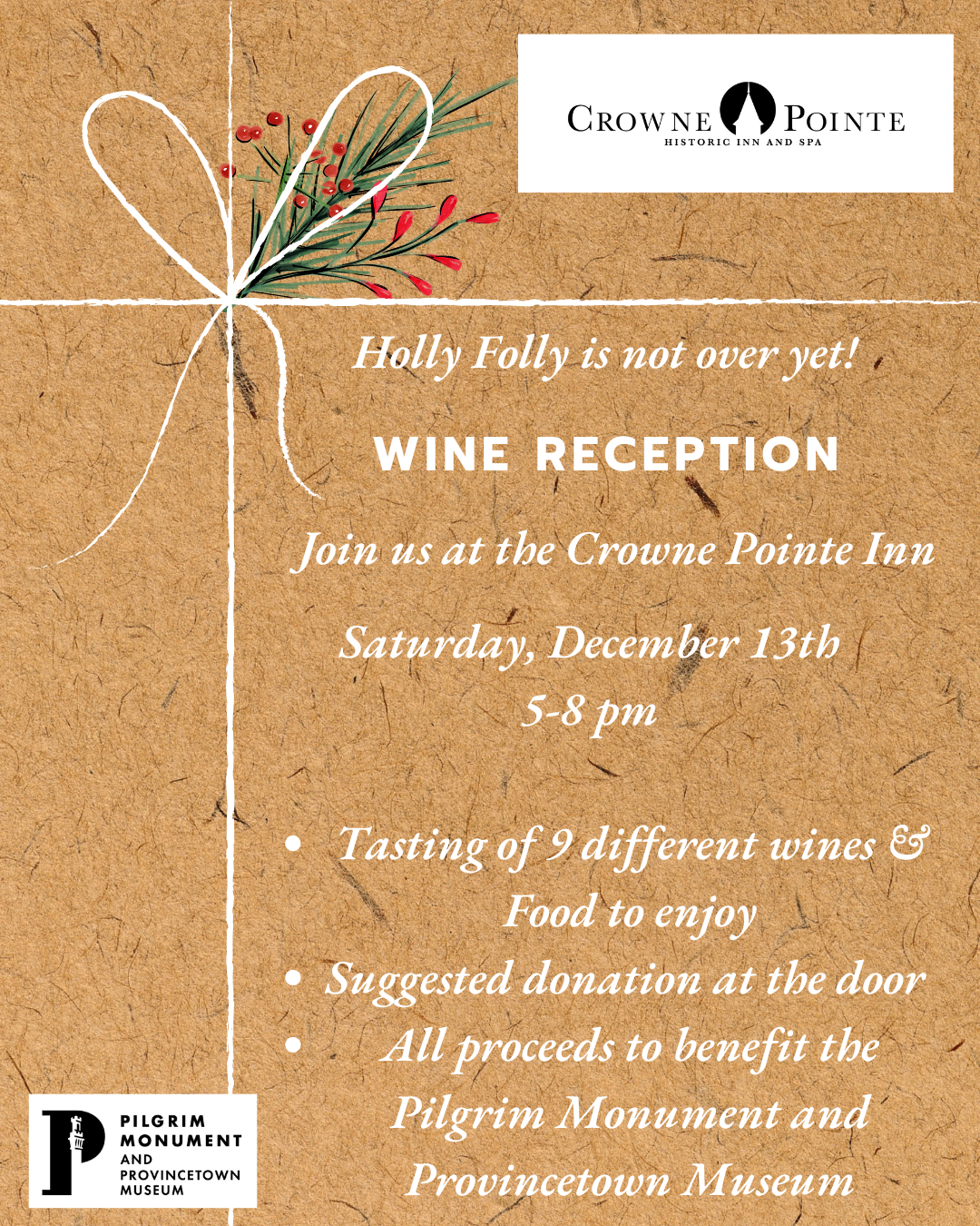 • Short Description Enjoy tastes of nine different wines and delicious bites in support of the Pilgrim Monument and Provincetown Museum.